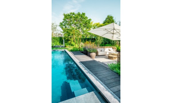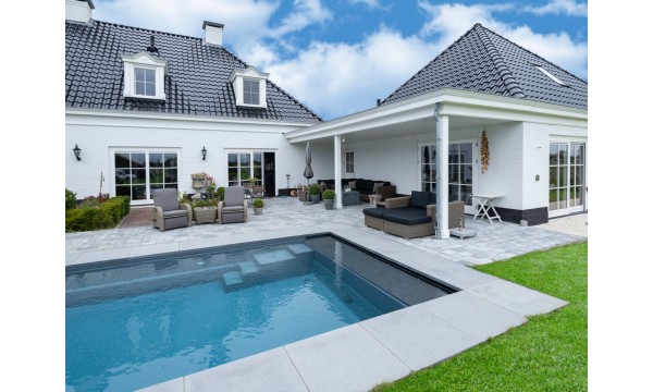 Бассейн LOUNGE — это сочетание строгой геометрии и функционального комфорта, идеально подходящее для современных участков. Модель имеет постоянную глубину чаши 1,5 м, что делает её универсальной для отдыха и плавания. Встроенная лестница с удобной площадкой служит не только для безопасного входа, но и как зона релакса. Компактные размеры бассейна позволяют эффективно использовать пространство, не жертвуя удобством. LOUNGE — это гармония минимализма, практичности и уюта.