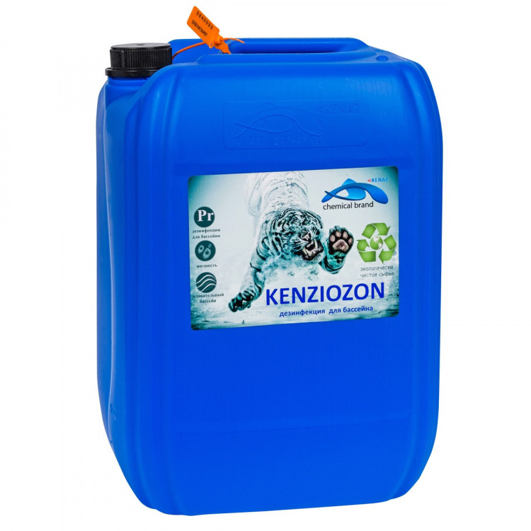 Жидкий дезинфектант на основе активного кислорода Kenaz Kenziozon. Это быстрорастворимый бесхлорный препарат, без явного химического запаха. Предназначен для шоковой и регулярной дезинфекции воды в частных бассейнах. Уничтожает до 99% известных бактерий, вирусов и водорослей. Создан специально для автоматических станций дозирования химии. Также может применяться в ручном режиме (с соблюдением всех мер безопасности). Производится по методу мембранного электролиза, что гарантирует практически полное отсутствие примесей побочных химических элементов и соединений. Препарат содержит пероксид водорода (hydrogen peroxide) 37%